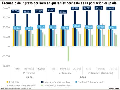 Por categoría ocupacional, el mayor ingreso promedio por hora continúa observándose en el empleo público. En el cuarto trimestre de 2024 se ubicaba en G. 33.530 y en igual periodo de 2025 ascendió a G. 36.790. El incremento absoluto fue de G. 3.260, con una variación de 9,7%. En los hombres del sector público, el ingreso pasó de G. 33.263 a G. 37.163, con una suba de G. 3.900 (11,7%), mientras que en las mujeres aumentó de G. 33.749 a G. 36.449, es decir, G. 2.700 más (8,0%).