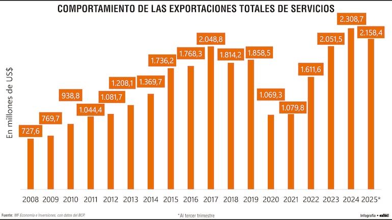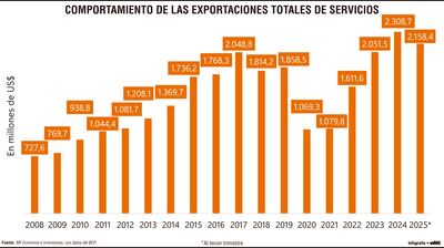 El contraste más ilustrativo surge al comparar 2008 con 2025. En ese periodo, el aumento absoluto fue de US$ 1.430,8 millones, lo que representa una expansión acumulada de aproximadamente 196,6%. En menos de dos décadas, las exportaciones de servicios casi se triplicaron en términos nominales.
