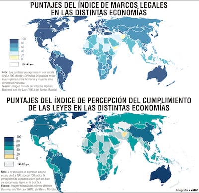 En promedio, las economías obtienen 67 puntos sobre 100 en el índice que mide la existencia de leyes favorables a la igualdad económica de género. Sin embargo, cuando se evalúan los sistemas institucionales que permiten implementar esas normas, el promedio cae a 47 puntos, y las percepciones sobre el cumplimiento efectivo de dichas leyes alcanzan 53 puntos. Estos resultados demuestran que la existencia de leyes igualitarias no siempre se traduce en oportunidades reales para las mujeres.