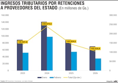 El detalle mensual confirma esta tendencia. En enero de 2026 las retenciones sumaron G. 69.952 millones, cifra 22% inferior a los G. 89.620 millones registrados en mismo periodo de 2025. En febrero la caída fue todavía más marcada: las retenciones alcanzaron G. 35.078 millones, lo que implicó una disminución de 35% frente a los G. 54.285 millones del mismo mes del año pasado.