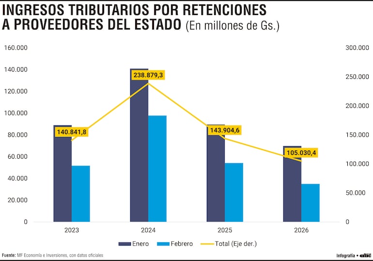 Al primer bimestre del año se observa una reducción significativa en el mencionado componente de la recaudación. De acuerdo con datos oficiales, entre enero y febrero de 2026 las retenciones realizadas por el MEF alcanzaron G. 105.030 millones, frente a G. 143.905 millones registrados en el mismo periodo de 2025. La diferencia equivale a una caída de G. 38.874 millones, es decir, una reducción de 27%. En términos aproximados, esto representa cerca de US$ 6 millones menos de ingresos tributarios en comparación con el año anterior.