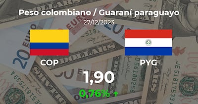 El Peso colombiano / Guaraní paraguayo se negocia a las 09:00 horas a 1,90 PYG, lo que supuso un cambio del 0,76% si se compara con el dato de la sesión previa, cuando acabó con 1,88 PYG.