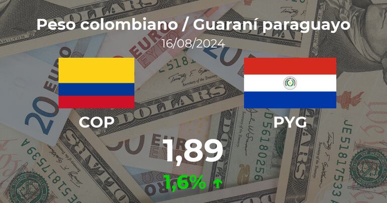 El Peso colombiano / Guaraní paraguayo se cotiza a las 09:00 horas a 1,89 PYG, lo que implicó un cambio del 1,6% comparado con los 1,86 PYG de la jornada previa.