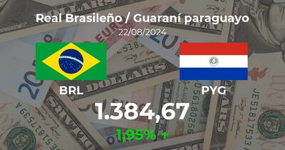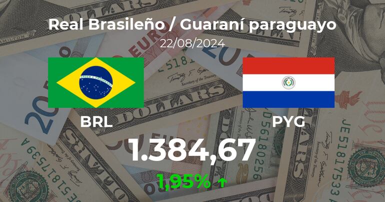 El Real Brasileño / Guaraní paraguayo se paga a las 09:00 horas a 1.384,67 PYG, lo cual implicó un cambio del 1,95% comparado con los 1.358,23 PYG de la sesión previa.