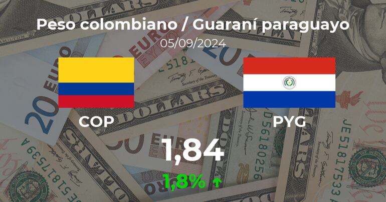 El Peso colombiano / Guaraní paraguayo se negocia a las 09:00 horas a 1,84 PYG, lo que implicó un cambio del 1,8% comparado con el valor de la sesión previa, cuando cerró con 1,81 PYG.