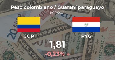 Jornada adversa para el Peso colombiano / Guaraní paraguayo, que se negocia a las 09:00 horas a 1,81 PYG, lo cual supuso un cambio del 0,23% con respecto a los 1,81 PYG de la sesión previa.