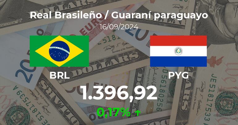 El Real Brasileño / Guaraní paraguayo se paga a las 09:00 horas a 1.396,92 PYG, de modo que supuso un cambio del 0,17% con respecto a los 1.394,61 PYG de la jornada anterior.
