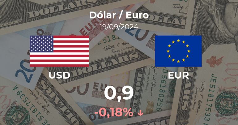 Jornada bajista para el Dólar / Euro, que se paga a las 09:00 horas a 0,9 euros, de modo que supuso un cambio del 0,18% frente a los 0,9 euros de la jornada previa.