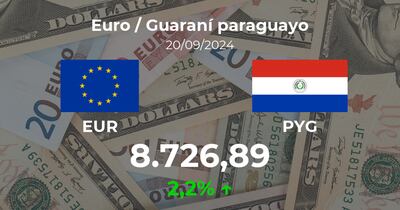 Tras la apertura de mercados el Euro / Guaraní paraguayo se paga a las 09:00 horas a 8.726,89 PYG, lo cual implicó un cambio del 2,2% comparado con la cifra de la jornada anterior, que fue de 8.538,95 PYG.