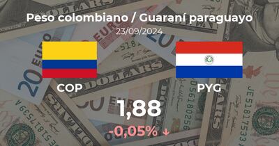 En la jornada de hoy el Peso colombiano / Guaraní paraguayo se paga a las 09:00 horas a 1,88 PYG, lo cual implicó un cambio del 0,05% si se compara con la cotización de la jornada anterior, cuando se situó en 1,88 PYG.