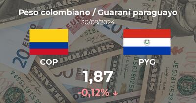 Jornada sin cambios para el Peso colombiano / Guaraní paraguayo, que se paga a las 09:00 horas a 1,87 PYG, de manera que supuso un cambio del 0,12% comparado con la cotización de la sesión previa, cuando cerró con 1,87 PYG.