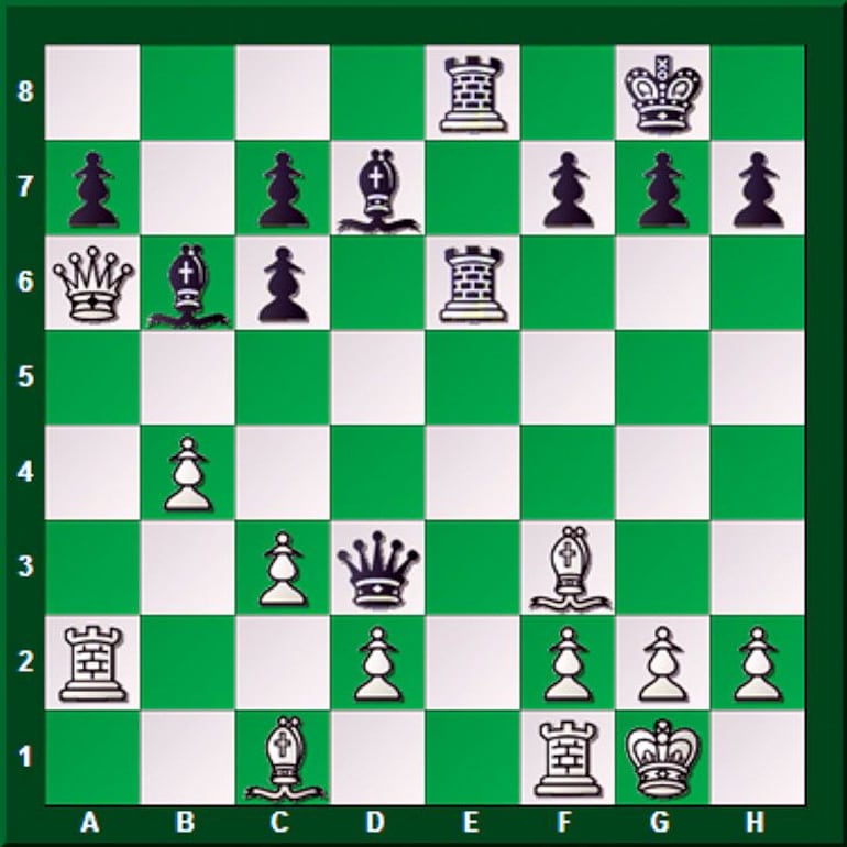 Louis Paulsen – Paul Morphy Apertura de los Cuatro Caballos [C48], Nueva York (4.6), 07.11.1857 1.e4 e5 2.Cf3 Cc6 3.Cc3 Cf6 4.Ab5 Ac5 5.0–0 0–0 6.Cxe5 Te8?! [La línea principal fue luego 6...Cxe5 7.d4 Ad6.] 7.Cxc6?! [Es mejor 7.Cf3 Cxe4 8.Cxe4 (no es mejor 8.d4 Cxc3 9.bxc3 Af8 10.d5 Ce7 11.Ac4 d6) 8...Txe4 9.d3 Te8 10.d4, con ligera ventaja blanca.] 7...dxc6 8.Ac4 b5 [No 8...Cxe4? por 9.Axf7+! Rxf7 10.Cxe4 Txe4? 11.Df3+.] 9.Ae2 Cxe4 10.Cxe4 [No 10.Af3? Cxf2! 11.Txf2 Dd4 12.Df1? Dxf2+! 13.Dxf2 Te1++] 10...Txe4 11.Af3 Te6 12.c3? [Un claro fallo de “Pensamiento profiláctico.” Es mejor la natural 12.d3.] 12...Dd3! [La dama obstaculiza el desarrollo del ala dama blanco.] 13.b4 Ab6 14.a4 bxa4 15.Dxa4 Ad7? [Una jugada natural y un error. Lo correcto era la antinatural 15...Ab7!, manteniendo el control de a6, el alfil queda momentáneamente fuera de juego pero no es grave luego de 16.Ta2 Tae8 17.Dd1 a5 seguido de ...Aa6; 17...Aa6 también vale.] 16.Ta2? [El error decisivo. Era fuerte 16.Da6! neutralizando la fuerza de la dama negra.] 16...Tae8 [Amenazando 17...Dxf1+ y mate.] 17.Da6 17…Dxf3!! [¡Magia pura! Eso es lo que sentí la primera vez que vi esta combinación.] 18.gxf3 Tg6+ 19.Rh1 Ah3 20.Td1 [O bien 20.Dd3 f5! 21.Td1 (o 21.Dc4+ Rf8! evitando Df7.) 21...Ag2+ 22.Rg1 Axf3+ 23.Rf1 Axd1 seguido de 24...f4, o 24...Tge6, ganando.] 20...Ag2+ 21.Rg1 Axf3+ 22.Rf1 Ag2+ [Hay algunos caminos algo más rápidos, pero, qué importa.] 23.Rg1 Ah3+ 24.Rh1 Axf2 25.Df1 Axf1 26.Txf1 Te2 27.Ta1 Th6 28.d4 Ae3 0–1 .