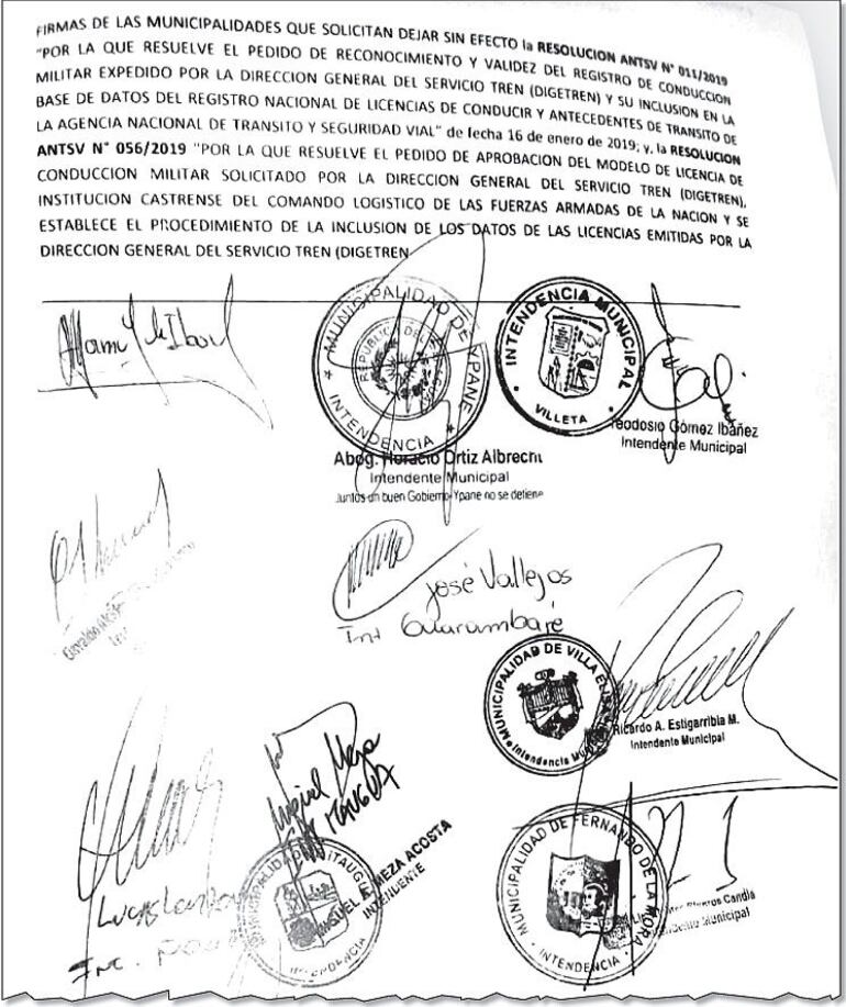 Una de ellas tiene las firmas de Fernando Negrette, intendente de Ypacaraí; Teodosio Gómez, de Villeta; Lucas Lanzoni, de Ñemby; José Vallejos, de Guarambaré, Ricardo Estigarribia, de Villa Elisa; Miguel Meza, de Itauguá, Alcides Riveros, de Fernando de la Mora, Horacio Ortiz de Ypané, entre otros.