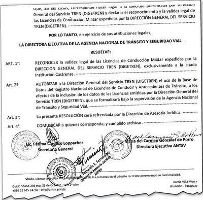 En una resolución anterior del 16 de enero de este año (N° 011), la ANTSV le autoriza también a la Digetren a utilizar la base de datos del registro nacional de licencias de conducir (que todavía no tiene) y antecedentes de tránsito, para incluir las informaciones de las licencias.