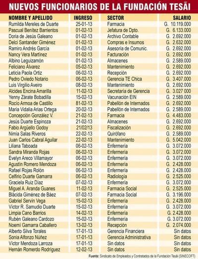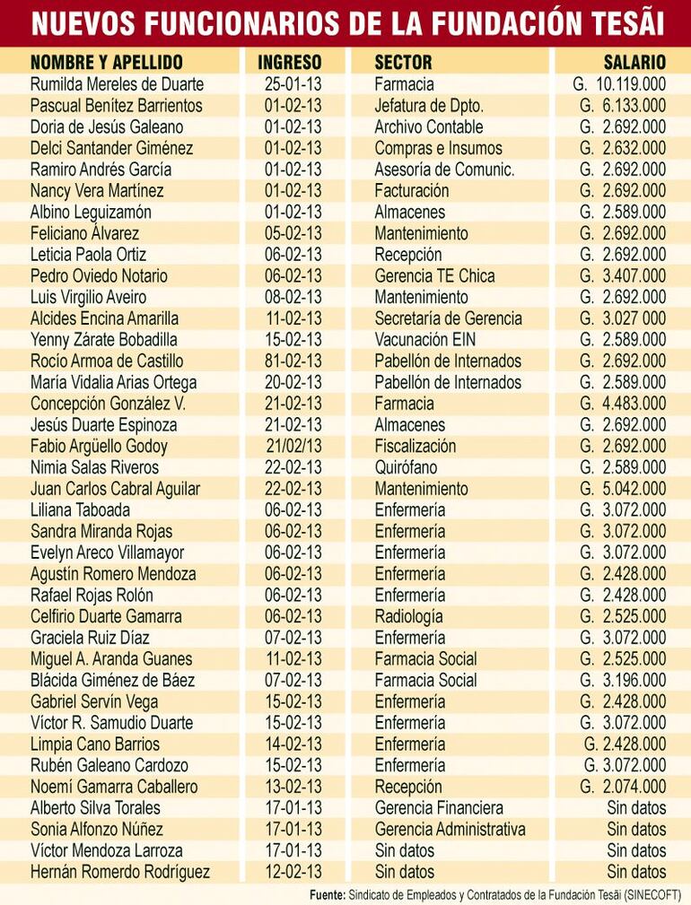 Según el Sindicato de Empleados y Contratados de la Fundación Tesãi (Sinecoft), la contratación de nuevos funcionarios hasta la fecha rondaría los 150. Todos son recomendados de líderes del Partido Liberal. Uno de los recomendados es la propia responsable de la gerencia administrativa, Sonia Alfonzo, quien ingresó el 17 de enero de este año.
