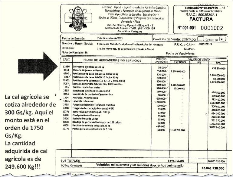 Inventar facturas para llenarlas con escandalosos sobrecostos fue una de las modalidades para la corrupción. Por caso, la cal agrícola se cotizaba entonces –diciembre de 2012– alrededor de 300 guaraníes el kg. Pero en la factura se hacía constar 1.750 guaraníes el kg. En una sola compra –según factura 0001001 de “Gran Horizonte”, supuestamente la Fenapropfh adquirió ¡249.600 kg!, por los que se pagaron cuatrocientos ochenta y seis millones ochocientos mil guaraníes.