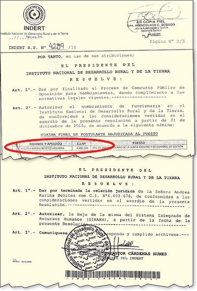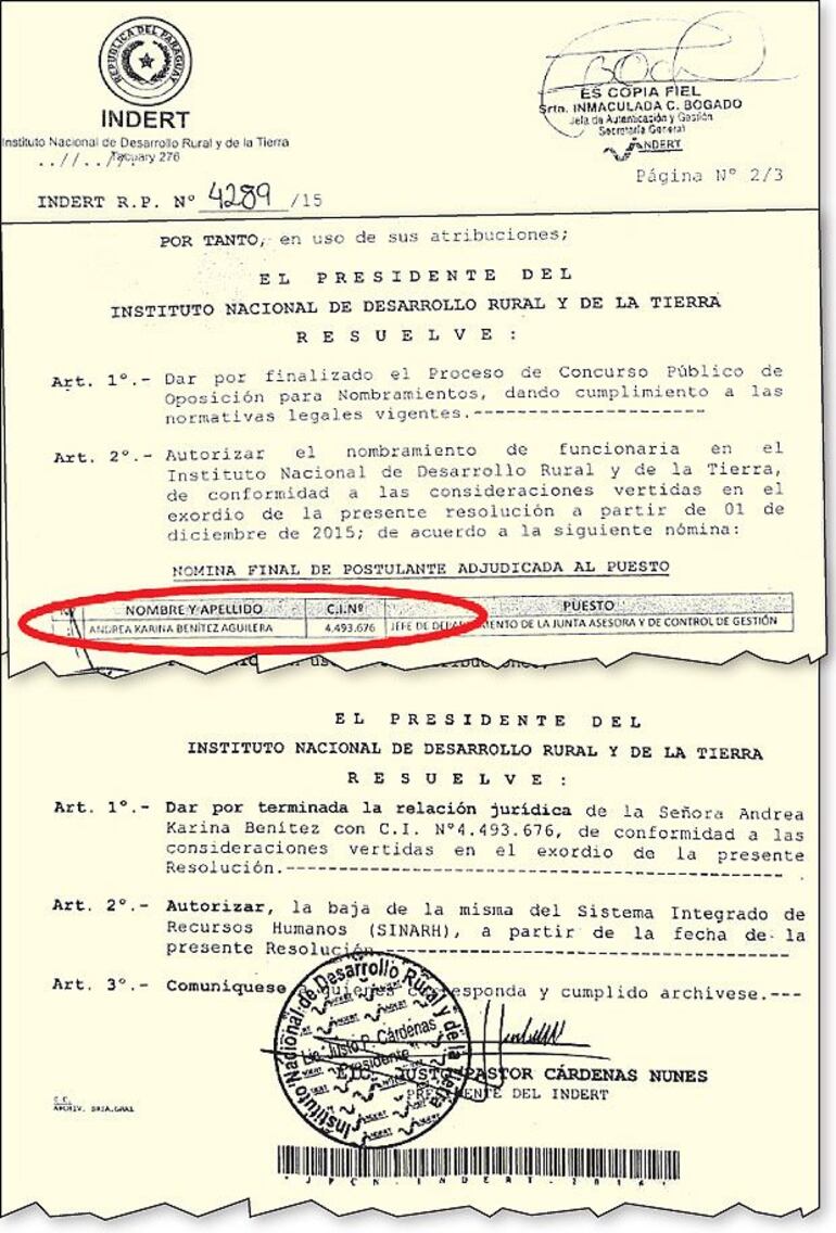 Los documentos indican que el 1 de diciembre pasado, Cárdenas firmó la Resolución 4289 por medio de la cual nombraba a la trabajadora como funcionaria permanente, pero el 17 de febrero de 2016, él firmó la resolución N° 264, en la que resolvió “dar por terminada la relación jurídica” de Benítez (ver facsímil).