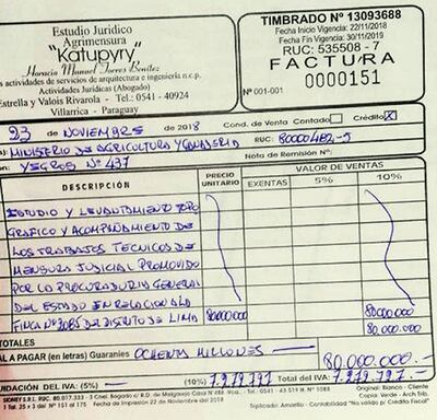 “Fue por un trabajo que hice el año antepasado en mi calidad de profesional agrimensor. Cuando eso no estaba vinculado con ninguna institución. Fui contratado como profesional independiente”, expresó. Comentó que fueron trabajos de mensura y deslinde hechos a pedido de la Procuraduría General de la República, en la finca 3085 del distrito de Lima.