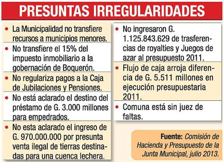 El presidente de la comisión de Presupuesto y Finanzas de la Junta Municipal, Eduardo Martínez (FG), dice que hay fuentes que hablan de una deuda cercana a los G. 800 millones. Agregó que la retención hecha por la Comuna no está siendo transferida desde 2007 y que existe un gran hermetismo sobre el asunto.