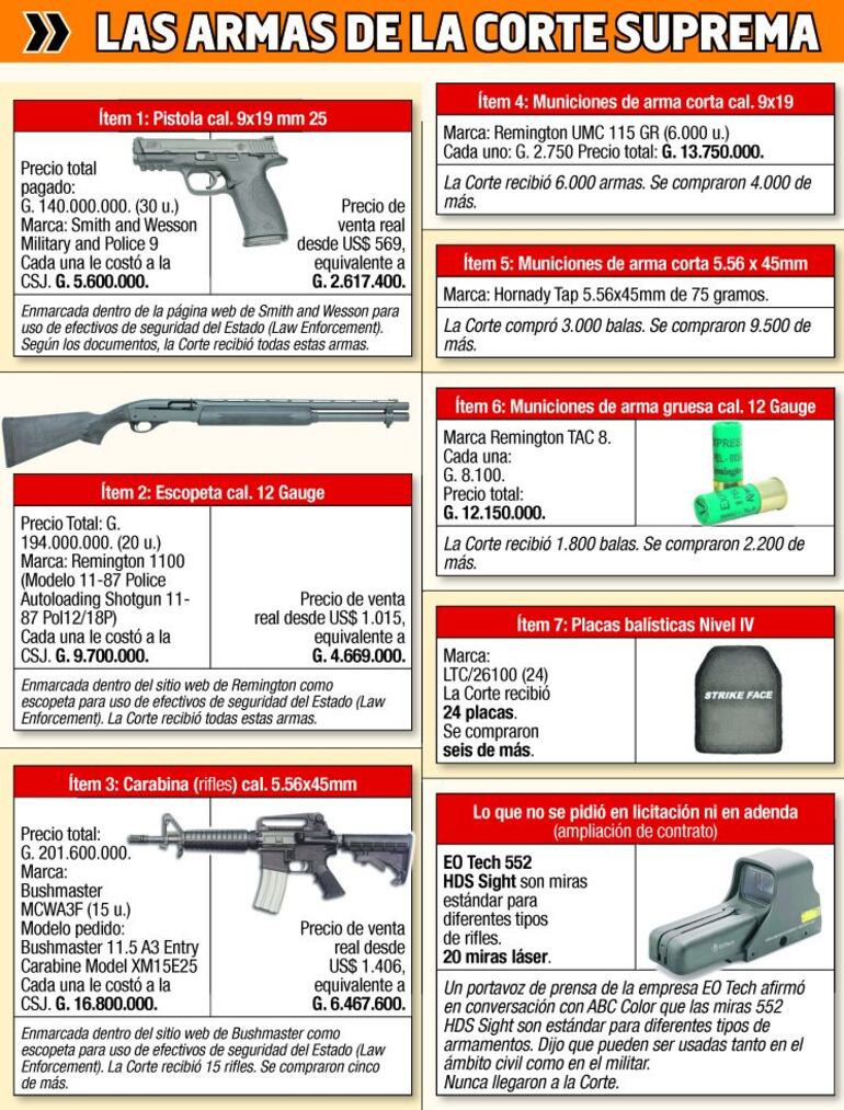 Las 20 escopetas de la marca estadounidense Remington “aparecieron” en los depósitos de la Dimabel el 30 de diciembre de 2011, mientras que el despacho aduanero real, con código “1200HC0400062A”, fue procesado el 29 de febrero de 2012. Como si fuera poco, un inventario hecho en la Corte hace figurar las armas como recibidas el 22 de noviembre de 2011. Es decir, las armas supuestamente llegaron a la sede de la Corte el 22 de noviembre de 2011. Dimabel hizo figurar en su depósito el 30 de diciembre del mismo año, pero el despacho correspondiente recién se realizó el 29 de febrero de 2012.