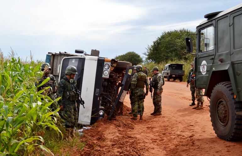 Cerca de las 17:40 del domingo último, los militares destinados a la base de operaciones denominada Sub Área de Pacificación (SAP) 6, ubicada en la colonia menonita “La Yeya”, departamento de San Pedro, en el límite con el área de Amambay, retuvieron un camioncito Kia Canter con placa AJX 352, que estaba al mando de Eugenio Ramos Quiñónez, para revisión.