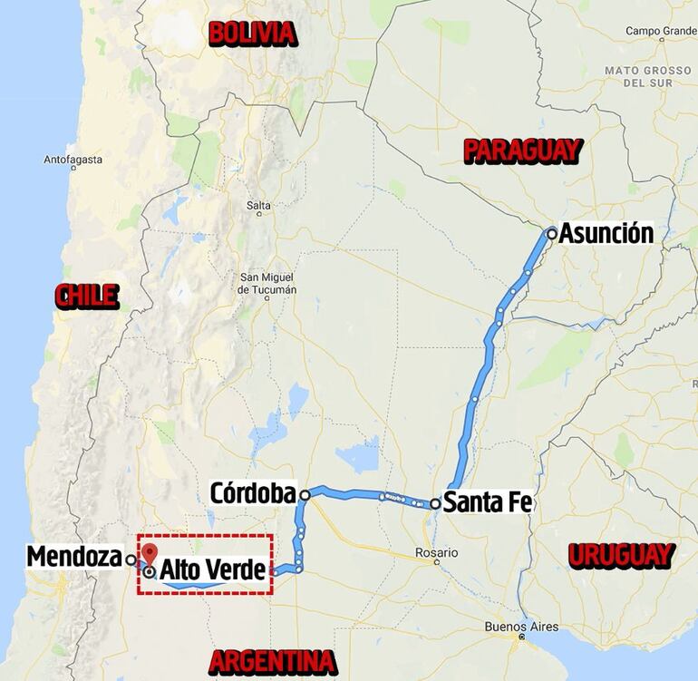 El operativo fue en la localidad de Alto Verde, 60 kilómetros antes de llegar a la ciudad de Mendoza, capital de la provincia del mismo nombre, a 1.850 kilómetros de Asunción (ver mapa).