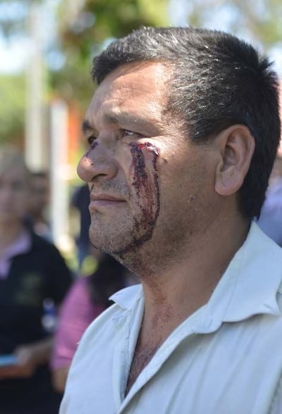Julio Díaz, quien se desempeña como chofer en la Fiuna, quedó con el rostro ensangrentado porque recibió el impacto de una piedra cuando se ocupaba de liberar los accesos de unas antenas colocadas por estudiantes para bloquear los accesos al estacionamiento, dijo.