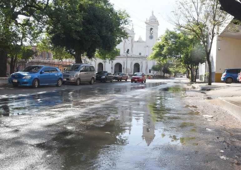 Desde la semana pasada, la avenida El Paraguayo Independiente, frente a la Comandancia de la Policía Nacional, pleno centro de Asunción, una importante pérdida de agua potable sigue sin ser solucionada por los operarios de la estatal, pese a los reiterados reclamos.