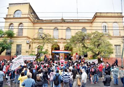 Luego marcharon bajo una pertinaz llovizna por la avenida Colón, siguieron por la calle Río de la Plata directo hasta la explanada del emblemático edificio del hospital de Clínicas, en el barrio Sajonia de la capital, que actualmente se encuentra parcialmente abandonado.