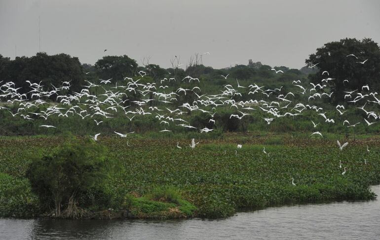 Un tendal de garzas blancas se alimentan desde estos días a orillas de la laguna del parque Ecobahía de la Fundación Milenio. Este sector del Banco San Miguel es considerado como una reserva ecológica de la ciudad por su alto valor ambiental y aportes al ecosistema. En esta época, estas aves migran en la región buscando lugares donde posarse, especialmente humedales.