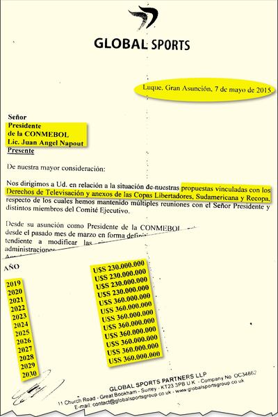 Finalmente, el 7 de mayo del 2015, la firma GLOBAL SPORTS presenta al entonces presidente de la Conmebol, Juan Ángel Napout (con prisión domiciliaria en EE.UU.) otra nueva propuesta, siempre por los mismos torneos. La oferta consistía en el pago de US$ 230 millones entre los años 2019 y 2022 y US$ 360 millones a partir del 2023 y hasta el 2030. Es decir, un ofrecimiento global de US$ 3.800 millones en 12 años de contrato.