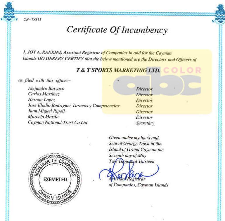Las crónicas de Fox en el negocio del fútbol –y dentro de la empresa que vehiculizó los sobornos a los dirigentes de la Conmebol– datan de hace casi veinte años, según prueban estos documentos. T&T Sports Marketing Ltd fue incorporada como empresa offshore el 12 de diciembre de 1997 en las Islas Caimán. Se constituyó como una “empresa exenta”, cualidad que le permite no tributar un solo centavo durante 30 años según la legislación allí vigente. Se emitieron 50.000 acciones y el 50% quedó en poder de Torneos y Competencias. El valor nominal de cada papel fue de US$ 1, por lo que su capital social inicial ascendió a 50.000 dólares. Y así se mantuvo hasta al menos el 31 de diciembre de 2014.
