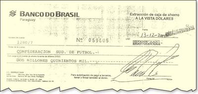 Con un cheque del Banco Do Brasil, New York Branch, 600 fifth avenue se pagaron 100.000 dólares de la Conmebol al propietario de una residencia que vendió la misma a Nicolás Leoz. El cheque data del 22 de diciembre del 2005 y la fecha de entrada de la escritura a los Registros Públicos quedó marcada para el 26 de enero del 2006, con número de entrada 360.397.
