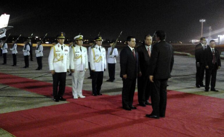 La llegada del Mandatario se dio pasadas las 20:00 en el Espigón Presidencial del aeropuerto Internacional Silvio Pettirossi, donde fue recibido por el vicepresidente Juan Afara, ministros del Poder Ejecutivo y autoridades castrenses. El jefe de Estado no dialogó con la prensa ni dio detalles sobre su exposición de Paraguay a inversores extranjeros.