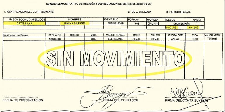 Pero lo más llamativo es que, ese mismo año, Irmina Sílfides Ortiz Silva de Escurra, que figura en la Subsecretaría de Estado de Tributación (SET) bajo el RUC OISI531630B, declaró el periodo fiscal (01/01/05 al 31/12/04) “SIN MOVIMIENTO”.