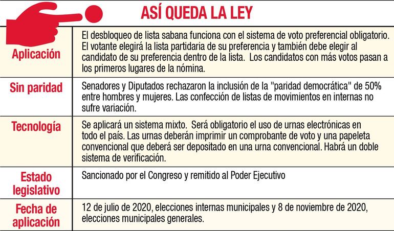 El desbloqueo de listas sábana funciona con el sistema de voto preferencial obligatorio. El votante elegirá la lista partidaria de su preferencia y también debe elegir al candidato de su preferencia dentro de la lista.