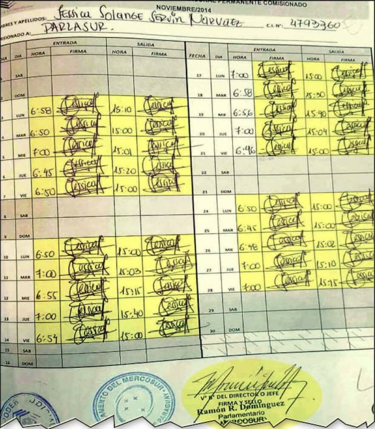 La falsificación de los datos involucra directamente al parlamentario del Mercosur, quien con su firma avala que la miss sí cumplía funciones en su despacho, cuando en realidad estaba en Japón.