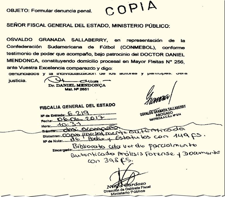 Sin embargo, pasaron ya casi tres meses (el 6 de junio de 2017) que la Confederación, a través de los abogados Osvaldo Granada Sallaverry y Daniel Mendonca, presentó una denuncia penal al fiscal general del Estado, con base en los resultados de una auditoría forense practicada a la matriz del fútbol sudamericano.
