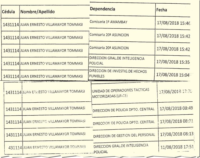 Documentos internos de la Policía a los que tuvo acceso ABC Color revelaron cómo en menos de diez días, agentes de diferentes dependencias realizaron 85 búsquedas de los antecedentes de Villamayor. Los mismos antecedentes que luego inundaron las redes sociales.