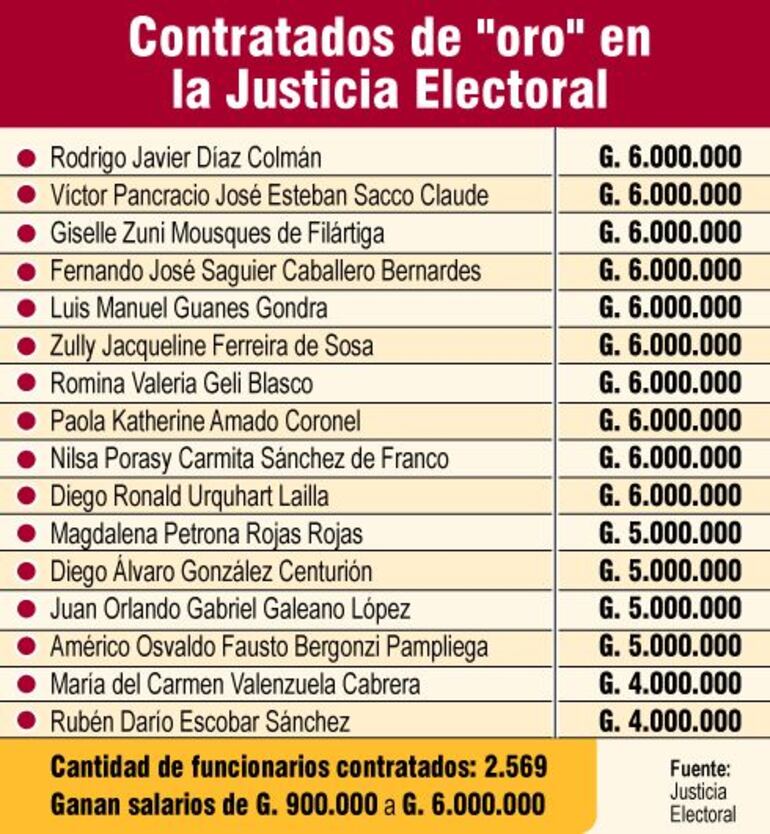 En su mayoría, los contratados ganan entre G. 900.000 y G. 3.000.000. Sin embargo, un selecto grupo de funcionarios percibe altos salarios pese a no ser permanentes. (Ver infografía).