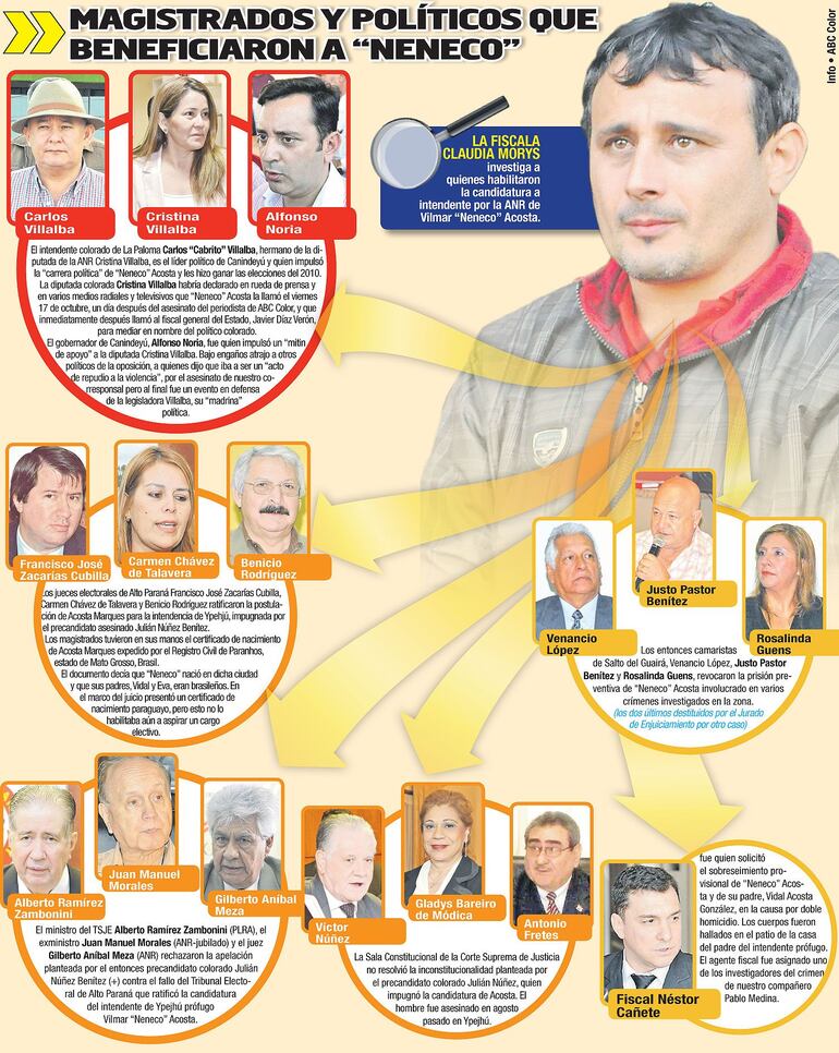Este artículo tiene 11 años de antigüedad El intendente de Ypejhú Vilmar “Neneco” Acosta, buscado por el asesinato del periodista de nuestro diario Pablo Medina, cosechó fuertes vínculos tanto en la política como en la justicia. El jefe comunal imputado por varios crímenes, recientemente fue expulsado de la ANR. Desde Canindeyú supo obtener apoyo a nivel jurisdiccional, quienes le brindaron “protección” en casos de homicidio y permitieron su candidatura como intendente colorado.