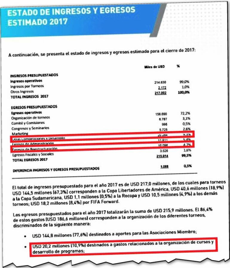 Casi US$ 6 millones en Marketing, cerca de US$ 7 millones en Comité y Comisiones y unos US$ 20 millones que primero figura como “Otras Competiciones” y luego aparece como “cursos”, son otras irregularidades del informe de la Conmebol.