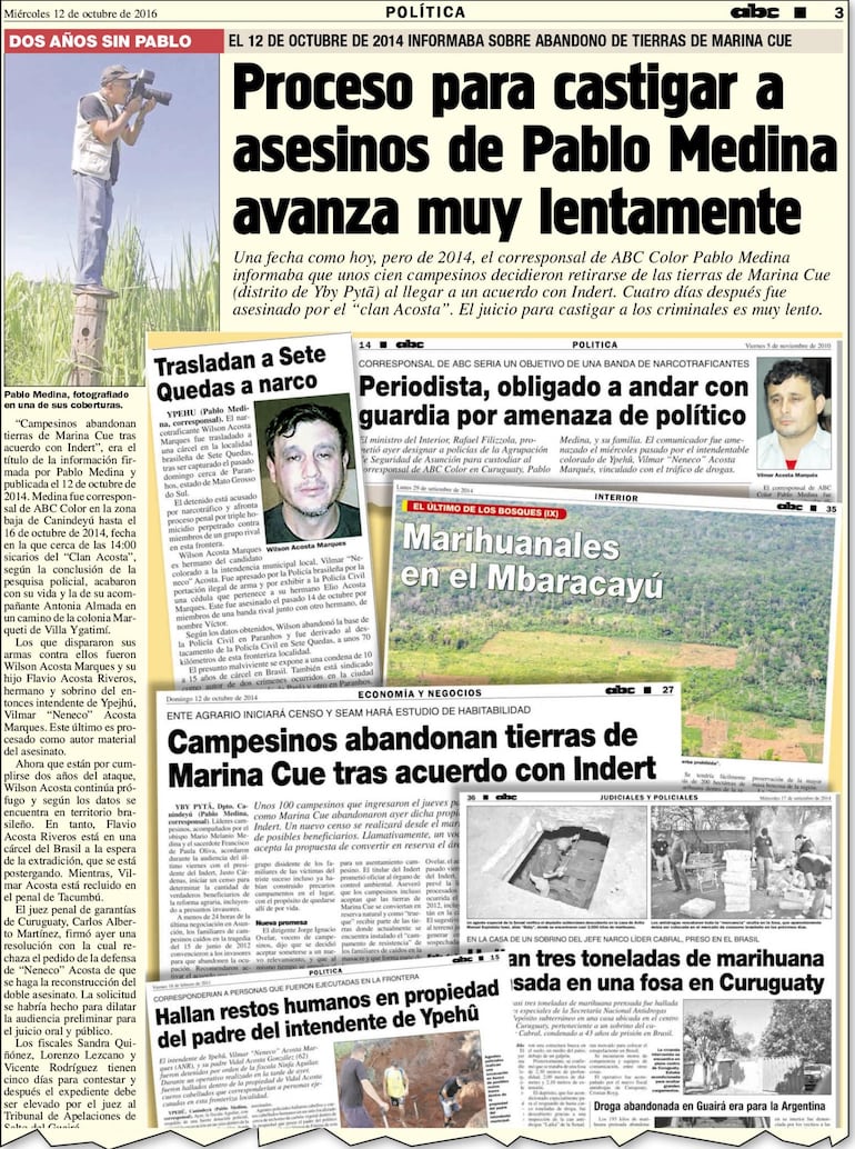 Pablo Medina, corresponsal de nuestro diario en Curuguaty, fue ejecutado a balazos por dos sicarios en una emboscada que tuvo lugar en un camino rural a 8 km del centro de Villa Ygatimí, el 16 de octubre del 2014.