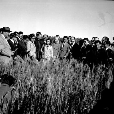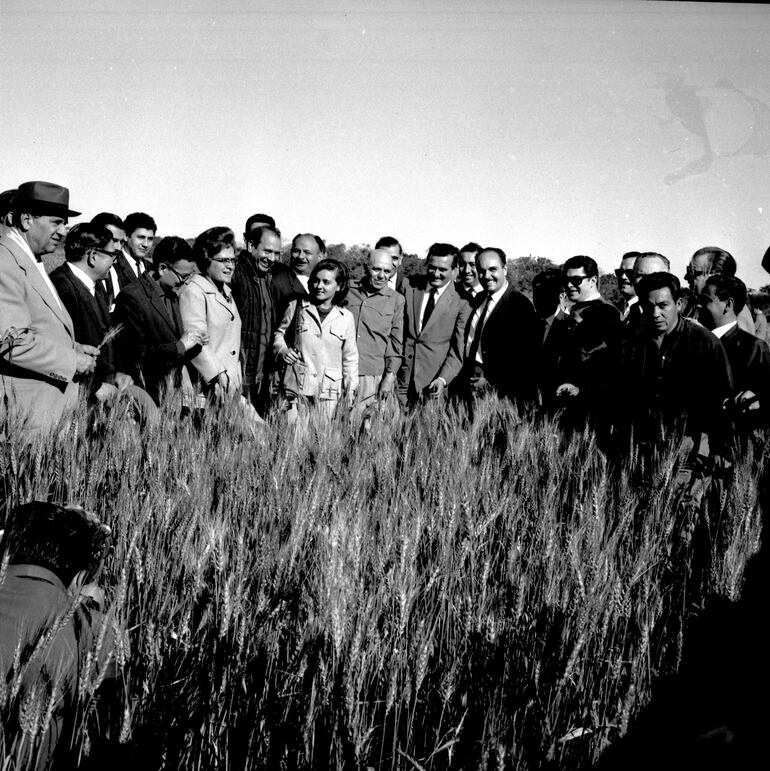 En 1968 existía en Arroyos y Esteros más de 1.200 hectáreas de trigales con una floreciente producción. El entonces ministro de Agricultura y Ganadería, Ing. Agr. Hernando Bertoni; el presidente del Banco Nacional de Fomento, Dr. Pedro Ramón Chamorro; el titular del IBR, Dr. Juan Manuel Frutos, acompañados de funcionarios y miembros de las fuerzas vivas del país, visitaron los trigales de esta ciudad y de La Colmena. En la imagen, un momento de la fotografía oficial de la visita del 8 de agosto de ese año.