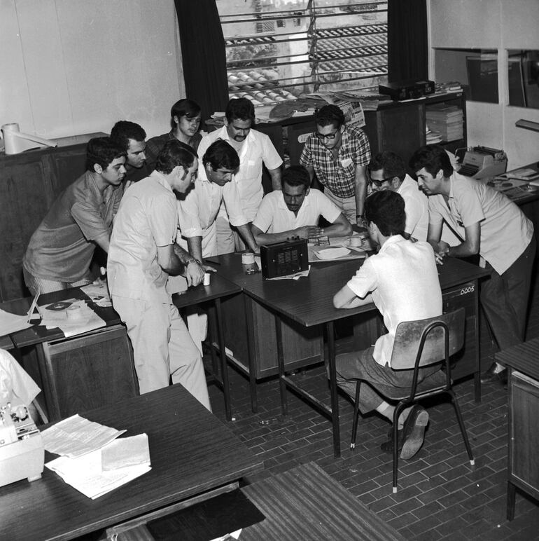 “Imantados por la Radiocadena Espacial, miembros de la redacción de ABC Color siguen segundo a segundo las alternativas del dramático descenso en el Pacífico Sur de la astronave Apolo 13″, decía el pie de esta foto publicada el 20 de abril de 1970.
