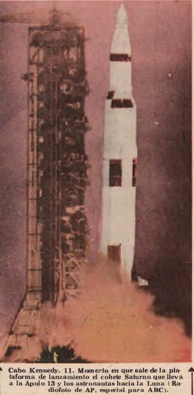 “Hacia las montañas de la Luna dirígese la astronave Apolo 13”, decía el titular principal de ABC Color el 12 de abril de 1970 y agregaba que “la riesgosa expedición norteamericana dará al hombre mayor conocimiento de los misterios del Cosmos”. La información proveniente de “Cabo Kennedy mostraba el momento en que sale de la plataforma de lanzamiento el cohete Saturno que lleva a la Apolo 13 y los astronautas hacia la Luna (Radiofoto de AP, especial para ABC)”. Los astronautas eran: James A. Lovell, Fred W. Haise y John L. Swigert.