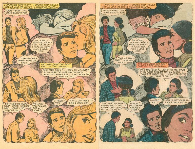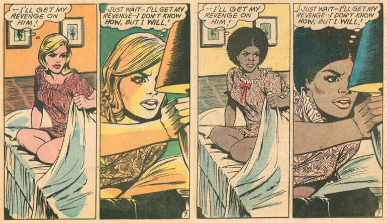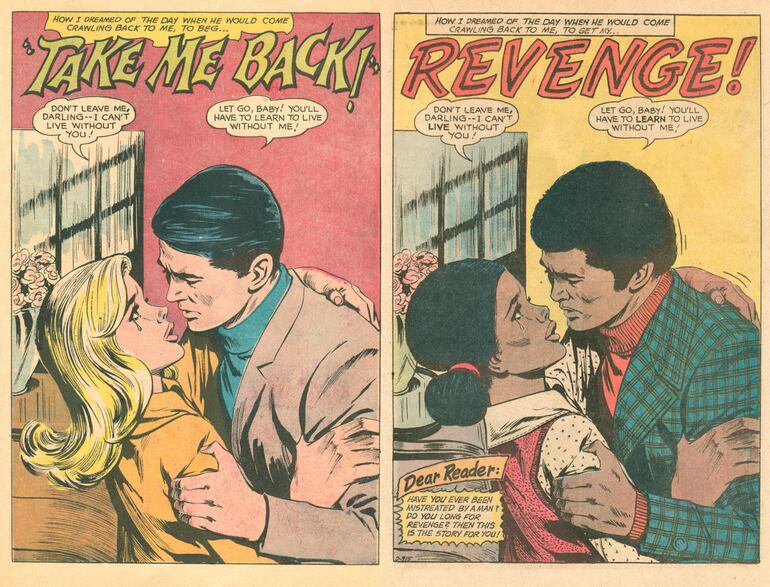 La historia narrada en «Take Me Back!» y «Revenge!» es simple y convencional. Un chico que pone fin a una relación amorosa que ya lo aburrió, una chica despechada que quiere venganza. En la publicación original, de 1967, el chico y la chica son blancos. Aunque el título es diferente en la versión afroamericana de 1972, la trama del relato se mantiene sin cambios, la secuencia de la narración en las viñetas es idéntica, los diálogos son prácticamente los mismos e incluso los nombres de los personajes se conservan intactos. La única diferencia importante, como puede verse en las páginas que reproducimos aquí, es la «raza» de los personajes.