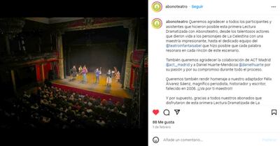 El pasado 30 de enero, el Teatro Infanta Isabel de Madrid acogió la lectura dramatizada de La Celestina, la tan conocida obra atribuida a Fernando de Rojas, aunque esta vez basada en la adaptación de Félix Álvarez Sáenz (Azofra, La Rioja, 1945-Cercedilla, Madrid, 2006), publicada en 1999 por la editorial Arandurã. El colectivo de actores, dirigidos por Daniel Huarte-Mendicoa y encabezados por Lupe Cartié Roda como la alcahueta Celestina, y Juan Gareda y Maria Irañeta como los mozos Calisto y Melibea, comenzó la lectura con una presentación del elenco y una puesta en contexto de la obra en la que, si bien quedaron claramente detallados sus pormenores, la figura de Álvarez Sáenz quedó algo fuera de la ecuación, no dando siquiera ningún apunte de que lo que el público estaría escuchando no partiría del todo de la figura que se supone autora original del texto.