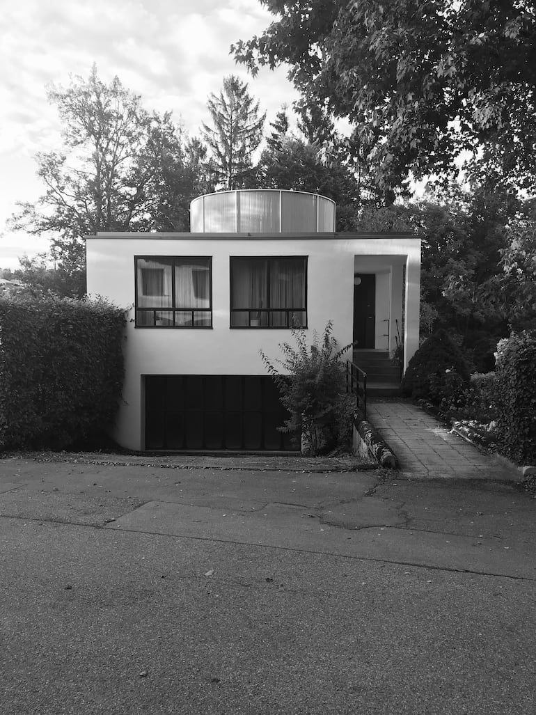 La estructura del edificio es la de un cubo alargado, que tiene una altura de un piso y medio en el lado sur y de tres pisos en el lado norte. Las distintas áreas de la casa se suceden a lo largo del eje longitudinal. Al situarse a lo largo de este eje, se hacen evidentes las relaciones entre los distintos espacios y la longitud de la casa. La biblioteca también se alinea con este eje. En las estanterías hay volúmenes de Goethe, Hölderlin, Schiller, Von Kleist, Engels, Marx, Joyce, Walser, Hermann Hesse y Günter Grass, entre otros autores. La sala alberga una pequeña colección de arte moderno, que incluye pinturas de Sean Scully, Hans Hartung y Günter Fruhtrunk, y esculturas de Eduardo Chillida, Jorge Oteiza y Joan Miró, entre otros artistas.