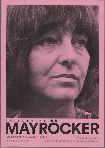 Tuvimos que esperar 30 años más para conocer su poesía con Scardanelli (a.d.a. libros, 2014), en traducción de José Luis Reina Palazón. El caso que hoy nos ocupa es la más reciente publicación de Mayröcker en España: Se secará como la hierba. Antología (1946-2009), editada por Arrebato Libros, con traducción de Sandra Santana y Magdalena Kotzurek. Un libro que confirma lo que ya había anunciado Scardanelli: una de las constantes de la poesía de Mayröcker es la dislocación del verso, como en el poema «Fría canción cortesana»: